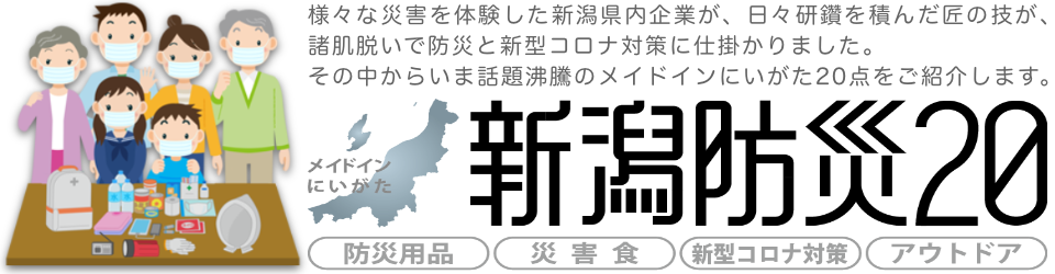 新潟県で生産している、防災用品、災害食、新型コロナ対策用品、アウトドア用など20点が紹介され、