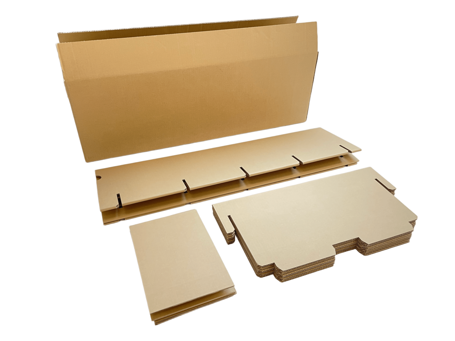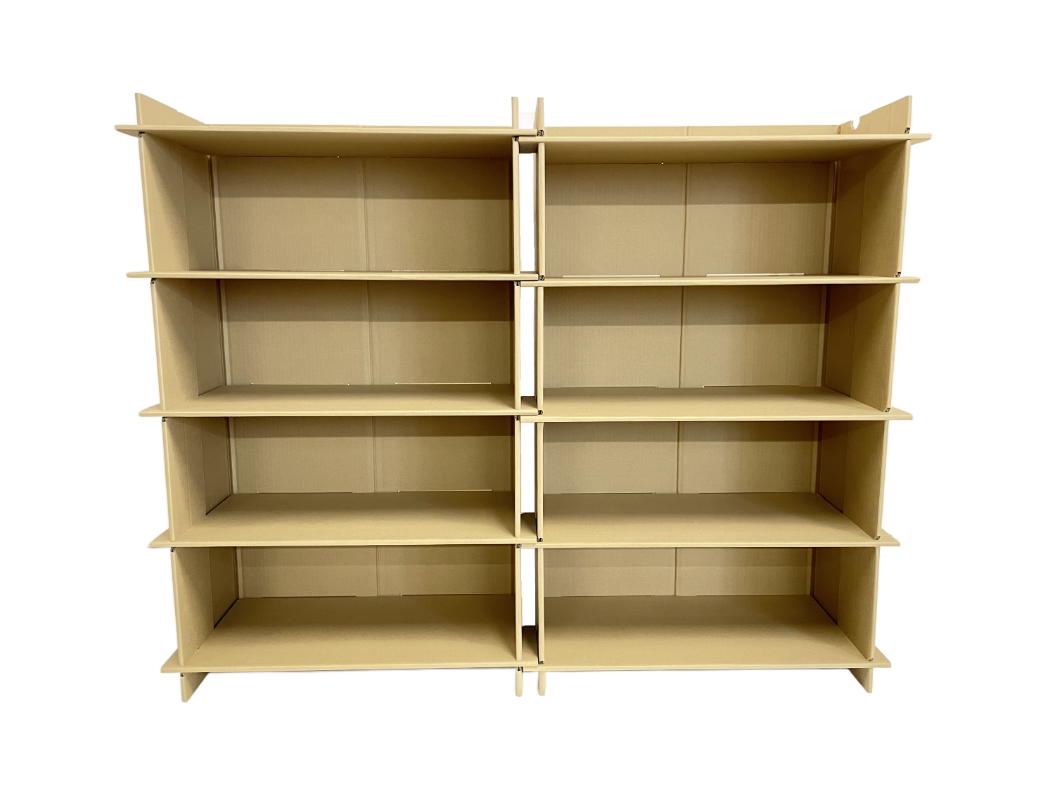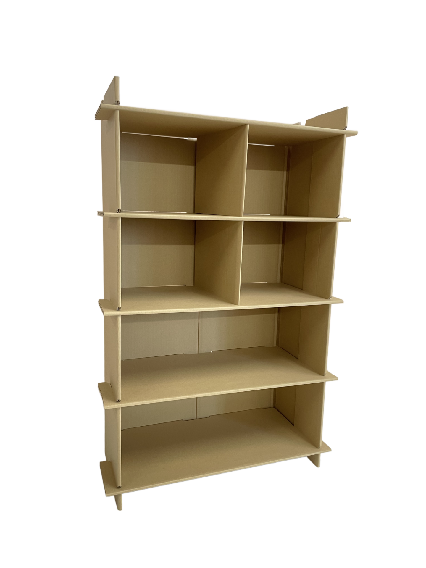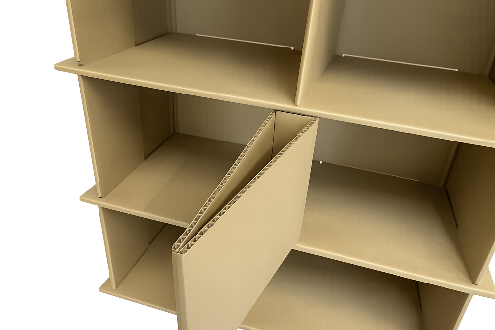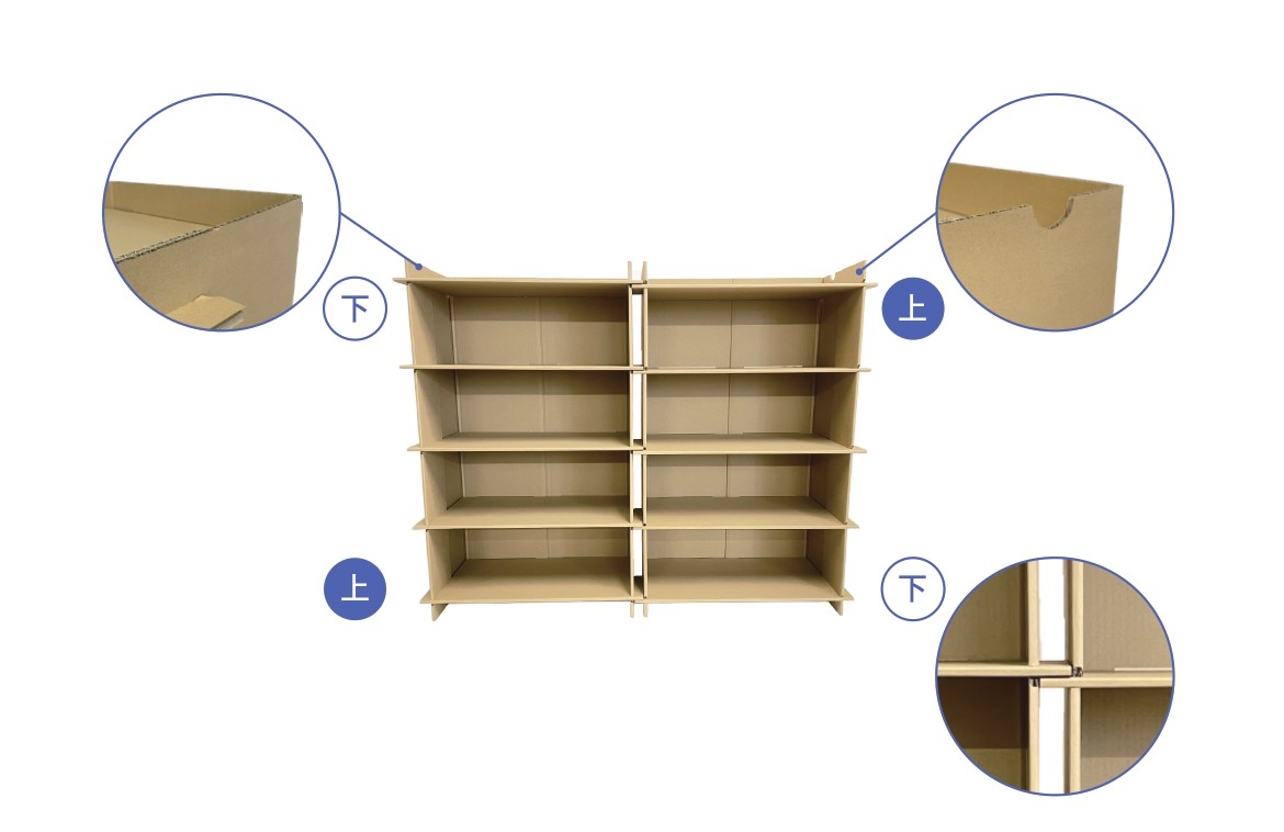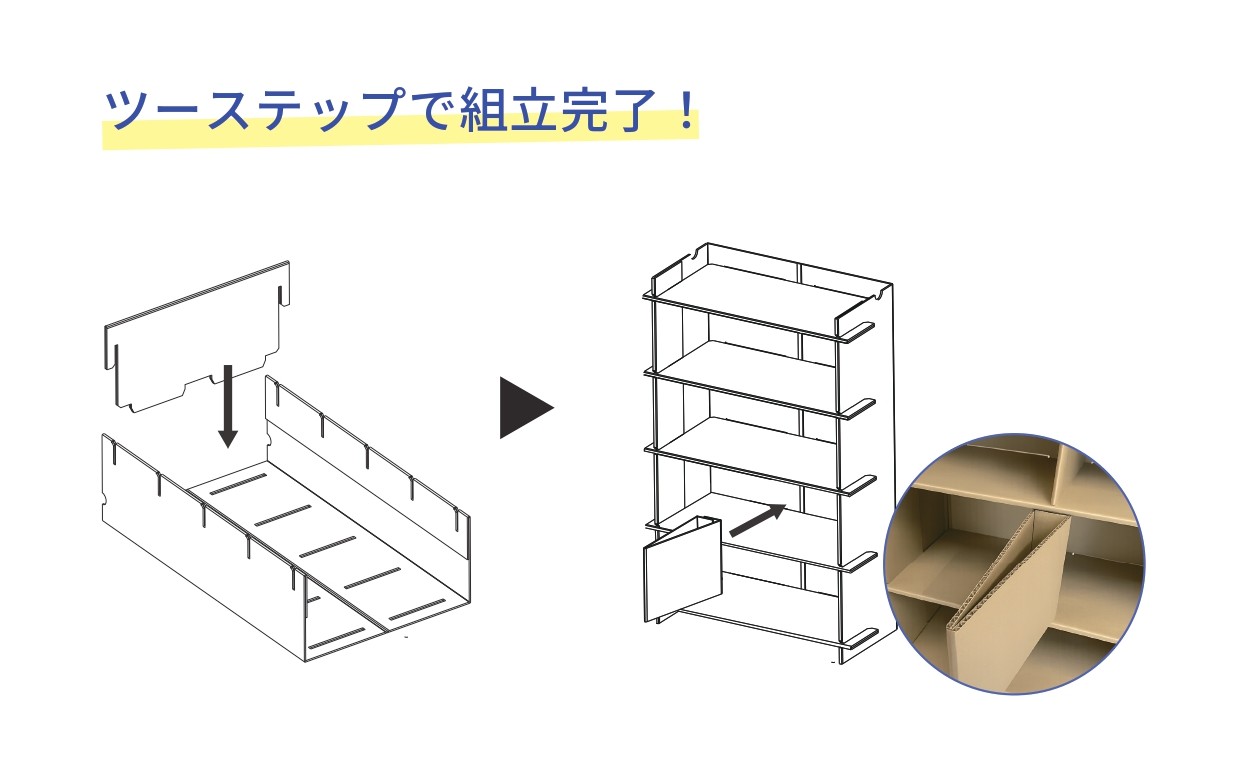 ➀ 外枠を床に寝かせ両脇をコの字に折り、棚板を溝に5枚はめ込んでください。